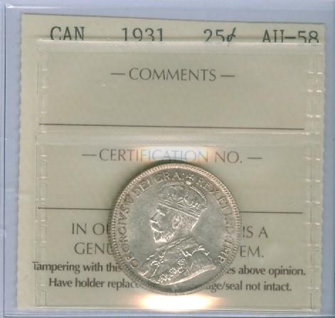 1931 25¢ ICCS AU58. Light golden rim tone with attractive lustre.