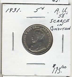 1931 5¢ AU58. Tougher date in nice grades. (PBA)