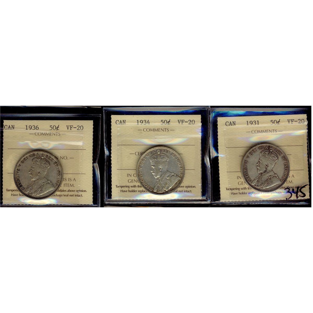 1931 50¢, 1934 & 1936 ICCS VF20. Lot of 3 coins.