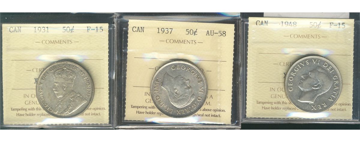 1931 50¢ & 1948 both F15 along with 1937 AU58. Lot of 3 ICCS coins.