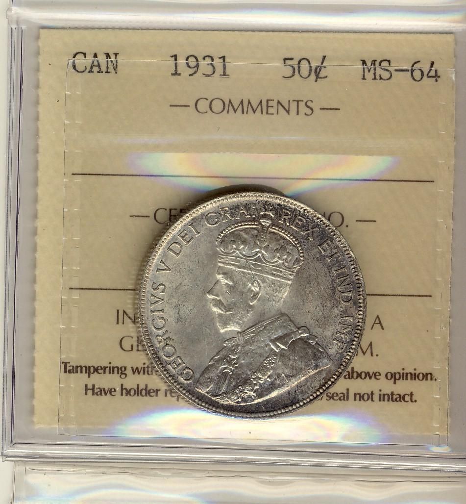 1931 50¢ ICCS MS64. Very light speckle tone but attractive.