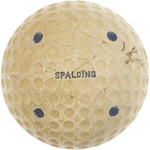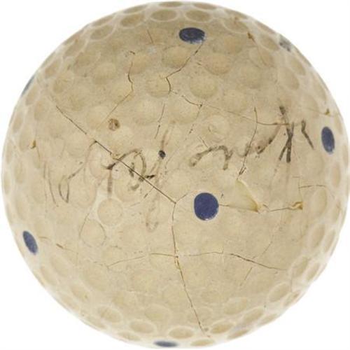 <B>1931 Bobby Jones Signed Golf Ball. </B></I> It is stories like this one that make us love the collecting hobby. The year was 1931, and a small North Carolina town was abuzz with the news that the legendary golfer Robert Tyre Jones, Jr., fresh from his sweep of the Grand Slam of golf, was to visit. Golf, we must remember, was one of the great spectator sports of the era, on a par with baseball and boxing, and Jones was even more beloved and admired than Tiger Woods is today. A twelve-year old boy, anxious to meet this Golden Age god, crouched in the brush and brambles that lined the fairway of the local golf course on the day that Jones was to play, and waited. Finally, in the distance, the dashing young golfer appeared on the tee, and launched his ball to a point in the fairway not far from where the boy was waiting. As Jones strode toward his ball in preparation of the second shot, the boy emerged from the woods. Trembling a bit with the nerves of coming face to face with his idol, the boy produced a golf ball from his hip pocket and extended it toward Jones. "Will you please sign this ball for me, sir?" he asked. Jones, ever the gentleman, kindly obliged, though he did question the medium. "The ink will never last on a golf ball, son," he told him. The youngster was undeterred, however. "I'll be really careful with it," he assured the golfing legend.<BR><BR> And so he was. The boy packed it in a cotton-filled matchbox, autograph side up, and there it remained for seventy years, before finally finding its way into the collecting hobby. The result is one of the most exciting golf artifacts to reach the auction block, a single signed "Robt Jones, Jr." golf ball, remaining in remarkable 5/10 to 6/10 condition due to the young collector's promised diligence. There is some crazing to the "Spalding Kro-flite" blue-dotted ball's surface, and while it does cross the path of Jones' ink, it does little to detract. Infinitely more rare than the Babe Ruth single signed baseball, this piece offers the serious golf collector the opportunity to play the next part in this fascinating and charming story that all began with a boy crouching in the North Carolina underbrush, waiting for a legend to arrive. <I>LOA from PSA/DNA. LOA from James Spence Authentication.</B></I> <BR><BR><b>Shipping:</b> Balls, Pucks, etc., Small (<a target="_blank" href="http://www.heritageauctions.com/common/shipping.php">view shipping information</a>)