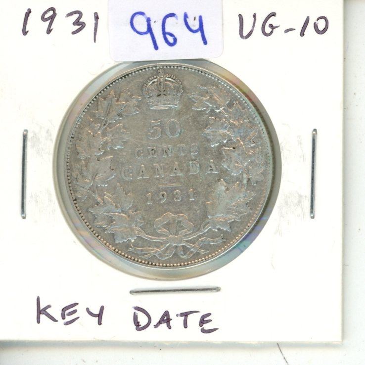 1931 Canadian Silver 50 Cents. Key Date. Mintage of 57,581. Issued during the Great Depression. VG-10.
