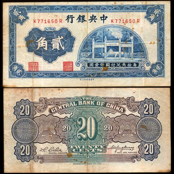 1931 China 20c Note Better Circulated (CUR-007346)