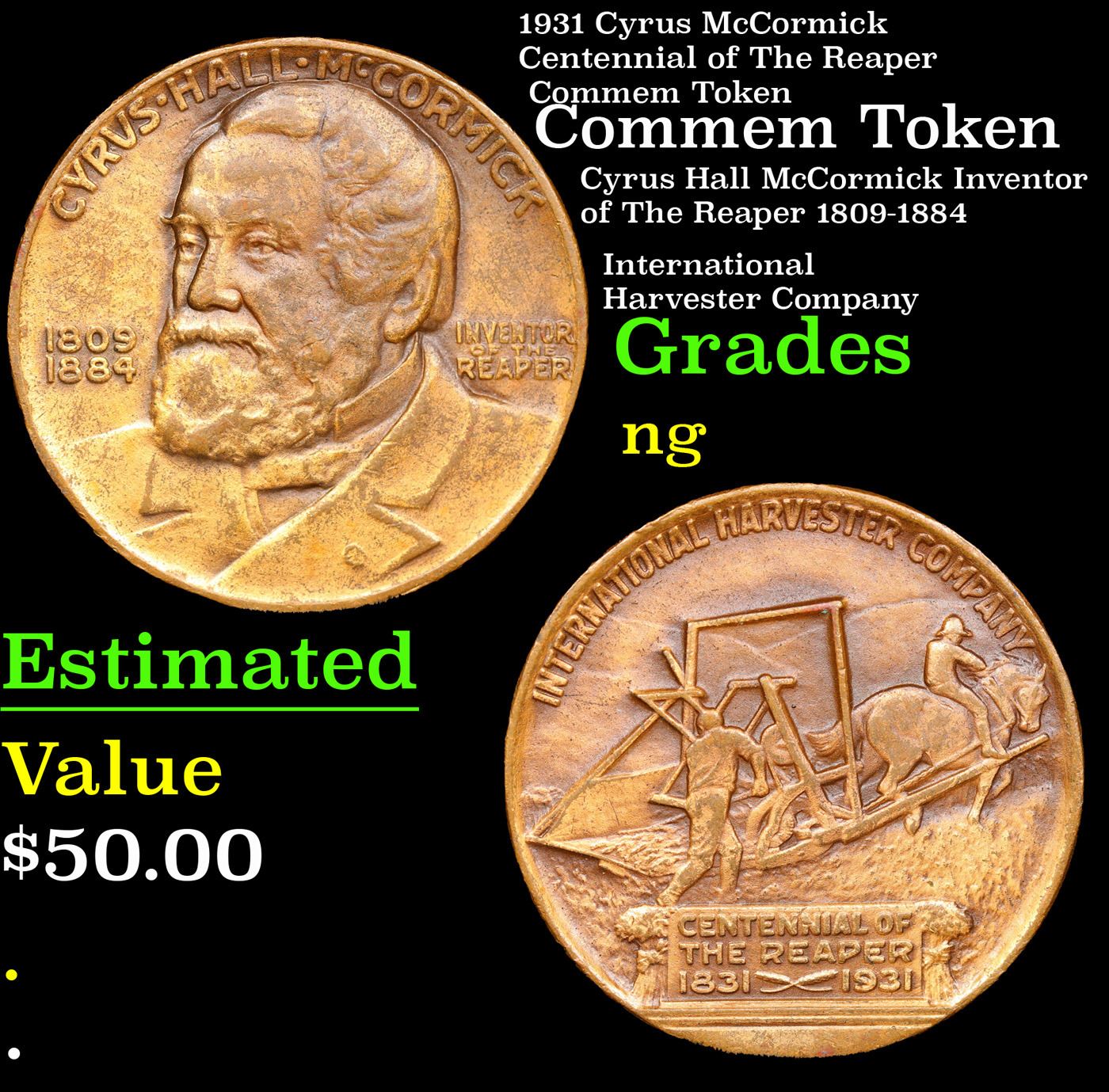 1931 Cyrus McCormick Centennial of The Reaper Commem Token Grades NG. Cyrus Hall McCormick was an American inventor and businessman who founded the McCormick Harvesting Machine Company, which later became part of the International Harvester Company in 1902. Originally from the Blue Ridge Mountains of Virginia, he and many members of the McCormick family became prominent residents of Chicago. McCormick has been simplistically credited as the single inventor of the mechanical reaper. He was, however, one of several designing engineers who produced successful models in the 1830s. His efforts built on more than two decades of work by his father Robert McCormick Jr., with the aid of Jo Anderson, who was enslaved by the family. He also successfully developed a modern company, with manufacturing, marketing, and a sales force to market his products.