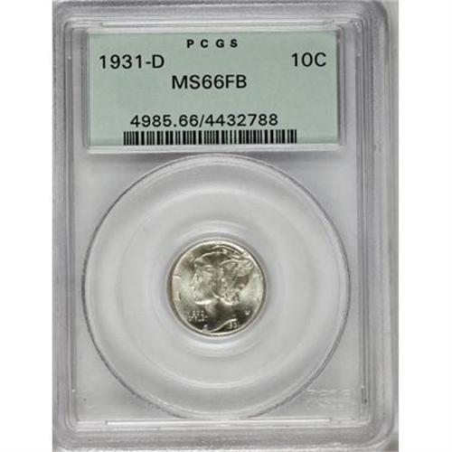 <B>1931-D 10C MS66 Full Bands PCGS.</B></I> PCGS Population (145/40). NGC Census: (45/12). Mintage: 1,260,000. Numismedia Wsl. Price for NGC/PCGS coin in MS66: $550. (#4985)<BR><BR><B>Coin Engraver:</B> Adolph A. Weinman<BR><BR><b>Shipping:</b> Coins & Currency (<a target="_blank" href="http://www.heritageauctions.com/common/shipping.php">view shipping information</a>)