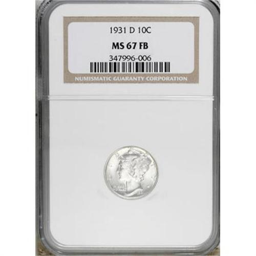 <B>1931-D 10C MS67 Full Bands NGC.</B></I> Brilliant and bold with potent luster and exceptionally smooth surfaces. A popular low mintage issue released near the depths of the Great Depression. Census: 10 in 67 Full Bands, 0 finer (11/07).<BR><BR><B>Coin Engraver:</B> Adolph A. Weinman<BR><BR><b>Shipping:</b> Coins & Currency (<a target="_blank" href="http://www.heritageauctions.com/common/shipping.php">view shipping information</a>)