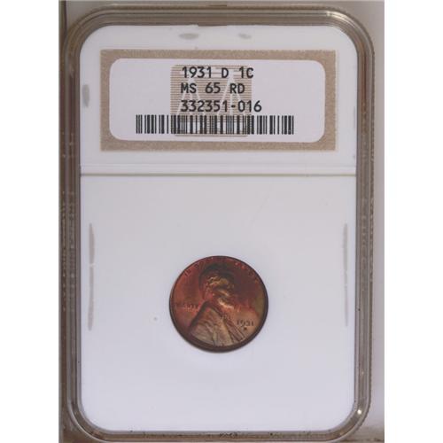 <B>1931-D<1C> MS65 Red NGC.</B></I> Cherry-red and olive-green luster dominates this crisply struck and well preserved Gem. A lower mintage Great Depression issue. Certified in an older generation holder. Census: 42 in 65, 9 finer (6/06).