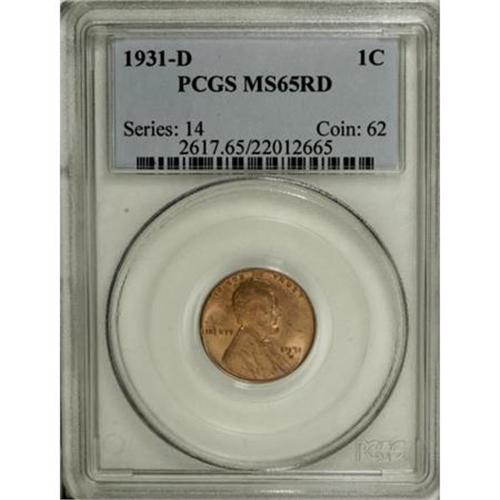 <B>1931-D 1C MS65 Red PCGS.</B></I> Copper-gold luster adorns both sides of this lovely well struck Gem. We note a few light flecks, mostly on the reverse.<BR><BR><B>Coin Engraver:</B> Victor D. Brenner<BR><BR><b>Shipping:</b> Coins & Currency (<a target="_blank" href="http://www.heritageauctions.com/common/shipping.php">view shipping information</a>)