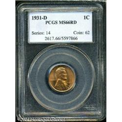 1931-D 1C MS66 Red PCGS. The 1931-D was produced i <B>1931-D 1C MS66 Red PCGS.</B></I> The 1931-D was produced in greater numbers (4.4 million pieces) than its similarly dated S-mint counterpart. Since the former issue was not recognized as an instant rarity, few high grade examples were deliberately set aside at the time of release. As such, the 1931-D is much more difficult to locate in MS66 Red than the more widely recognized 1931-S. A simply stunning Gem, the surfaces are alive with sparkling reddish-orange luster and boldly impressed devices. The amount of spotting is minimal, both for the grade and the issue, and we can find not even the faintest trace of mellowing. A rare bidding opportunity for the dedicated Lincoln Cent collector.<BR><I>From The Dennis Dewart Collection.</B></I> <BR><BR><B>Important notice:</B> Heritage usually auctions material at the rate of 200-250 lots per hour. On some occasions eBay Live bid software or the Internet may not be able to keep up with the pace of the auction. We recommend placing a realistic absentee bid now as insurance to avoid disappointment. Occasionally the auctioneer may eliminate or reject an eBay Live bid, and the auctioneer may also reopen a lot after the close of the eBay live bidding (usually because we missed an audience bid), and may reject your bid even if it shows you as the winning bidder. By bidding via eBay Live, you agree that Heritage may award the lot to another bidder at its sole discretion under the circumstances described above or any other reasonable circumstances. Since eBay bids are not shown to us until we open the lot on the floor, we treat those bids just like floor bids. In most cases the floor responds before the eBay bid is presented to us, due to Internet lag time, so for consistency we have made it a policy that floor bids are always considered first over tie eBay live bids. Also please note that all Heritage lots purchased through eBay Live carry a 20% Buyer's Premium. Please make sure you read the Terms and Conditions before you bid. This lot is being auctioned in conjunction with a live floor auction by Heritage Galleries & Auctioneers. All final auction and invoice information will be supplied by Heritage Galleries & Auctioneers, and all other information should be considered preliminary. Lot:5170