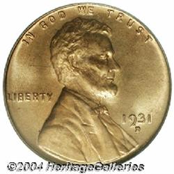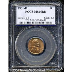 <B>1931-D<1C> MS66 Red PCGS.</B></I> This is a surprisingly scarce issue from a mintage that ranks in the "bottom 10" for numbers produced. Among Lincoln cents of the 1930s, only the '31-S has a lower mintage. This is an extremely important opportunity to acquire a pristine Gem example of the issue. PCGS has only certified one finer example over nearly 20 years of grading coins. This is a brilliant Gem with lustrous orange mint color and only a few tiny spots and abrasions. <BR><BR><B>Important notice:</B> Heritage usually auctions material at the rate of 200-250 lots per hour. On some occasions eBay Live bid software or the Internet may not be able to keep up with the pace of the auction. We recommend placing a realistic absentee bid now as insurance to avoid disappointment. Occasionally the auctioneer may eliminate or reject an eBay Live bid, and the auctioneer may also reopen a lot after the close of the eBay live bidding (usually because we missed an audience bid), and may reject your bid even if it shows you as the winning bidder. By bidding via eBay Live, you agree that Heritage may award the lot to another bidder at its sole discretion under the circumstances described above or any other reasonable circumstances. Since eBay bids are not shown to us until we open the lot on the floor, we treat those bids just like floor bids. In most cases the floor responds before the eBay bid is presented to us, due to Internet lag time, so for consistency we have made it a policy that floor bids are always considered first over tie eBay live bids. Also please note that all Heritage lots purchased through eBay Live carry a 20% Buyer's Premium. Please make sure you read the Terms and Conditions before you bid.