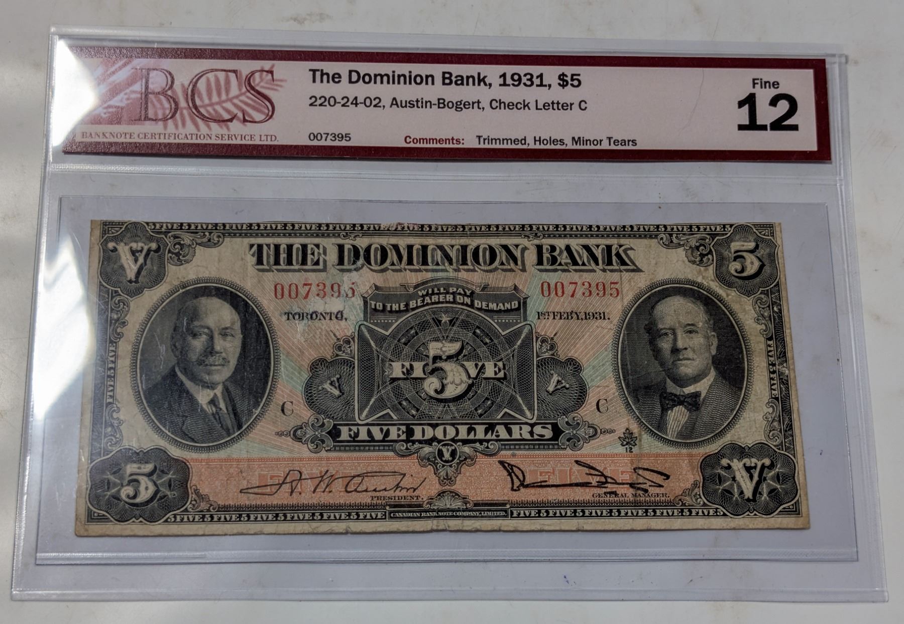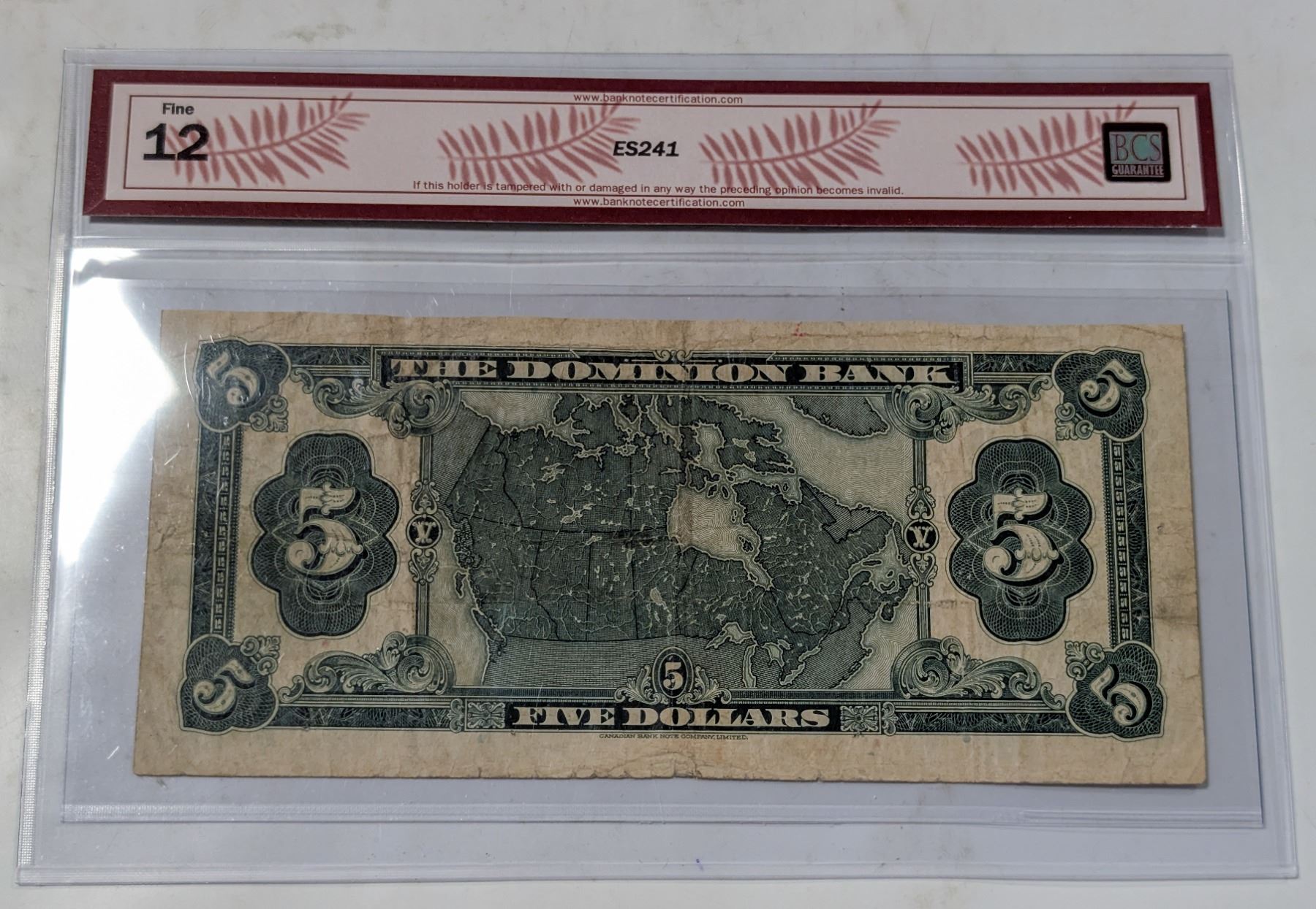 1931 DOMINION BANK $5 BANKNOTE. CERTIFIED.