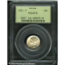 1931-S 10C MS64 Full Bands PCGS. Whispers of light <B>1931-S 10C MS64 Full Bands PCGS.</B></I> Whispers of light olive color visits lustrous surfaces. Nicely struck, and a few grade-defining marks on Mercury's cheek and neck. <BR><BR><B>Important notice:</B> Heritage usually auctions material at the rate of 200-250 lots per hour. On some occasions eBay Live bid software or the Internet may not be able to keep up with the pace of the auction. We recommend placing a realistic absentee bid now as insurance to avoid disappointment. Occasionally the auctioneer may eliminate or reject an eBay Live bid, and the auctioneer may also reopen a lot after the close of the eBay live bidding (usually because we missed an audience bid), and may reject your bid even if it shows you as the winning bidder. By bidding via eBay Live, you agree that Heritage may award the lot to another bidder at its sole discretion under the circumstances described above or any other reasonable circumstances. Since eBay bids are not shown to us until we open the lot on the floor, we treat those bids just like floor bids. In most cases the floor responds before the eBay bid is presented to us, due to Internet lag time, so for consistency we have made it a policy that floor bids are always considered first over tie eBay live bids. Also please note that all Heritage lots purchased through eBay Live carry a 20% Buyer's Premium. Please make sure you read the Terms and Conditions before you bid. This lot is being auctioned in conjunction with a live floor auction by Heritage Galleries & Auctioneers. All final auction and invoice information will be supplied by Heritage Galleries & Auctioneers, and all other information should be considered preliminary. Lot:5823