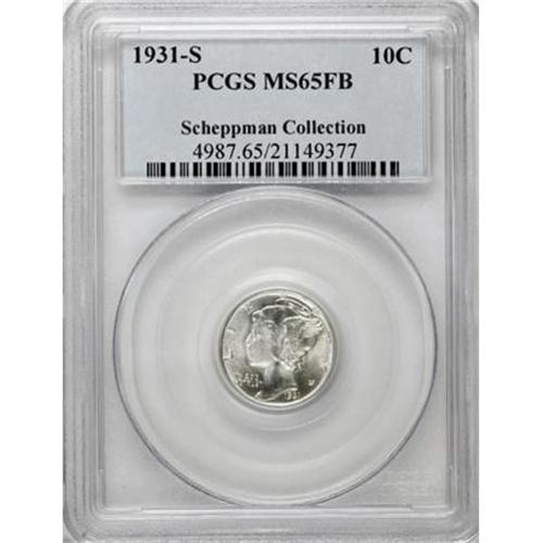 <B>1931-S 10C MS65 Full Bands PCGS.</B></I> A gleaming and minimally toned silver-white survivor from this pivotal San Francisco issue, sharply struck with excellent visual appeal. The obverse presents beautifully, and though a small abrasion is present in the right reverse field, its presence is consistent with the grade assigned. Population: 50 in 65 Full Bands, 42 finer (12/07).<BR><I>From The Scheppman Collection, #4 PCGS Registry of Full Band Mercury Dimes.</B></I><BR><BR><B>Coin Engraver:</B> Adolph A. Weinman<BR><BR><b>Shipping:</b> Coins & Currency (<a target="_blank" href="http://www.heritageauctions.com/common/shipping.php">view shipping information</a>)