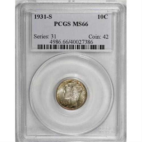<B>1931-S 10C MS66 PCGS.</B></I> PCGS Population (34/1). NGC Census: (44/6). Mintage: 1,800,000. Numismedia Wsl. Price for NGC/PCGS coin in MS66: $300. (#4986)<BR><BR><B>Coin Engraver:</B> Adolph A. Weinman<BR><BR><b>Shipping:</b> Coins & Currency (<a target="_blank" href="http://www.heritageauctions.com/common/shipping.php">view shipping information</a>)