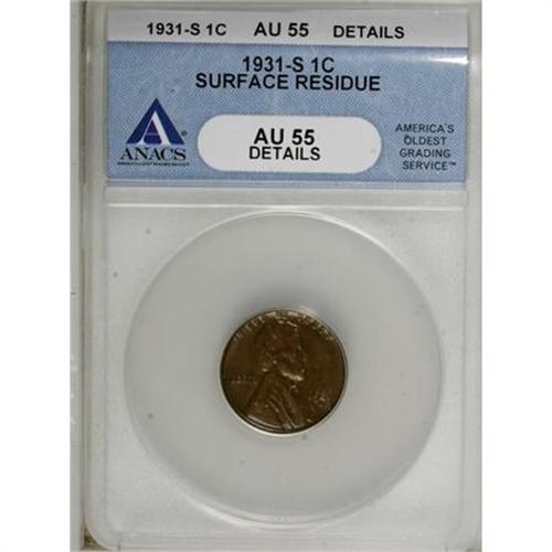 <B>1931-S 1C --Surface Residue--ANACS. AU55 Details.</B></I> NGC Census: (0/703). PCGS Population (0/1936). Mintage: 866,000. (#2620)<BR><BR><B>Coin Engraver:</B> Victor D. Brenner<BR><BR><b>Shipping:</b> Coins & Currency (<a target="_blank" href="http://www.heritageauctions.com/common/shipping.php">view shipping information</a>)