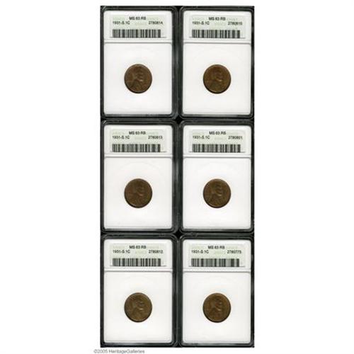 <B>1931-S<1C> MS63 Red and Brown ANACS,</B></I> six Select examples of this low mintage collector favorite. Each is closer to Red than Brown, and the strikes range from decent to sharp. A few small marks and spots accompany each piece.<BR><I>From The New Zealand Collection.</B></I>