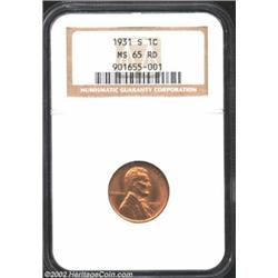 1931-S 1C MS65 Red NGC. A glowing golden-orange example with only a few small specks of discoloration on the reverse. Much above-average for this popular low-mintage issue. Important notice: We expect to be auctioning lots at the rate of 200-250 per hour. Sometimes eBay Premier live bid software cannot keep up with that pace, so we strongly recommend that you place a realistic proxy bid now as insurance to avoid disappointment. Also please note that all Heritage/CAA lots purchased through eBay Premier carry a 20% Buyer's Premium. Please make sure you read the Terms and Conditions.