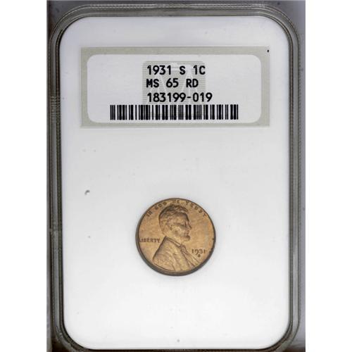 <B>1931-S<1C> MS65 Red NGC.</B></I> A lustrous brick-red representative with pleasing preservation and an above average strike. The lowest business strike mintage of the series, aside from the 1909-S V.D.B. <BR><BR><B>Important notice:</B> Heritage usually auctions material at the rate of 200-250 lots per hour. On some occasions eBay Live bid software or the Internet may not be able to keep up with the pace of the auction. We recommend placing a realistic absentee bid now as insurance to avoid disappointment. Occasionally the auctioneer may eliminate or reject an eBay Live bid, and the auctioneer may also reopen a lot after the close of the eBay live bidding (usually because we missed an audience bid), and may reject your bid even if it shows you as the winning bidder. By bidding via eBay Live, you agree that Heritage may award the lot to another bidder at its sole discretion under the circumstances described above or any other reasonable circumstances. Since eBay bids are not shown to us until we open the lot on the floor, we treat those bids just like floor bids. In most cases the floor responds before the eBay bid is presented to us, due to Internet lag time, so for consistency we have made it a policy that floor bids are always considered first over tie eBay live bids. Also please note that all Heritage lots purchased through eBay Live carry a 20% Buyer's Premium. Please make sure you read the Terms and Conditions before you bid. This lot is being auctioned in conjunction with a live floor auction by Heritage Galleries & Auctioneers. All final auction and invoice information will be supplied by Heritage Galleries & Auctioneers, and all other information should be considered preliminary. Lot:664 <BR><BR><B>Winning Notification and Billing:</B> After the FINAL session in this auction is complete, Heritage will send e-mail and snail mail invoices. This process normally takes several days. All final auction and invoice information will be supplied by Heritage Galleries & Auctioneers, and all other information should be considered preliminary. <BR><BR>This auction will be conducted on a live auction floor and over the Internet through eBay Live. If you choose to place an absentee bid, please take a moment to <font color='#0000ff'><u><a href='http://pages.ebay.com/liveauctions/help/before/laabsentee.html'>learn how eBay Live absentee bidding works</a></u></font><font color='#000000'>