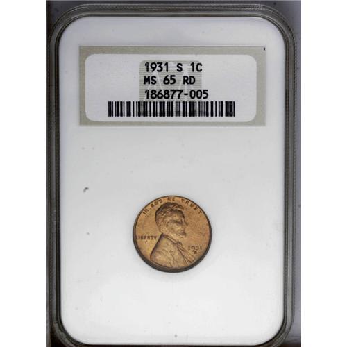 <B>1931-S<1C> MS65 Red NGC.</B></I> An impressive cherry-red Gem that benefits from a bold strike and relatively clean surfaces. A series key in circulated grades, and also popular in quality Mint State. Housed in an older NGC holder. <BR><BR><B>Important notice:</B> Heritage usually auctions material at the rate of 200-250 lots per hour. On some occasions eBay Live bid software or the Internet may not be able to keep up with the pace of the auction. We recommend placing a realistic absentee bid now as insurance to avoid disappointment. Occasionally the auctioneer may eliminate or reject an eBay Live bid, and the auctioneer may also reopen a lot after the close of the eBay live bidding (usually because we missed an audience bid), and may reject your bid even if it shows you as the winning bidder. By bidding via eBay Live, you agree that Heritage may award the lot to another bidder at its sole discretion under the circumstances described above or any other reasonable circumstances. Since eBay bids are not shown to us until we open the lot on the floor, we treat those bids just like floor bids. In most cases the floor responds before the eBay bid is presented to us, due to Internet lag time, so for consistency we have made it a policy that floor bids are always considered first over tie eBay live bids. Also please note that all Heritage lots purchased through eBay Live carry a 20% Buyer's Premium. Please make sure you read the Terms and Conditions before you bid. This lot is being auctioned in conjunction with a live floor auction by Heritage Galleries & Auctioneers. All final auction and invoice information will be supplied by Heritage Galleries & Auctioneers, and all other information should be considered preliminary. Lot:665 <BR><BR><B>Winning Notification and Billing:</B> After the FINAL session in this auction is complete, Heritage will send e-mail and snail mail invoices. This process normally takes several days. All final auction and invoice information will be supplied by Heritage Galleries & Auctioneers, and all other information should be considered preliminary. <BR><BR>This auction will be conducted on a live auction floor and over the Internet through eBay Live. If you choose to place an absentee bid, please take a moment to <font color='#0000ff'><u><a href='http://pages.ebay.com/liveauctions/help/before/laabsentee.html'>learn how eBay Live absentee bidding works</a></u></font><font color='#000000'>
