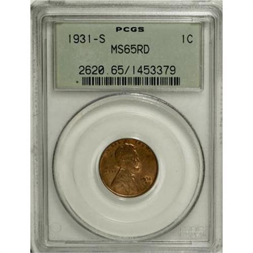 <B>1931-S 1C MS65 Red PCGS.</B></I> This low mintage cent has scintillating luster, a good strike, and a few splashes of orange-red across the predominantly straw-gold fields. Encapsulated in an old green label holder.<BR><BR><B>Coin Engraver:</B> Victor D. Brenner<BR><BR><b>Shipping:</b> Coins & Currency (<a target="_blank" href="http://www.heritageauctions.com/common/shipping.php">view shipping information</a>)