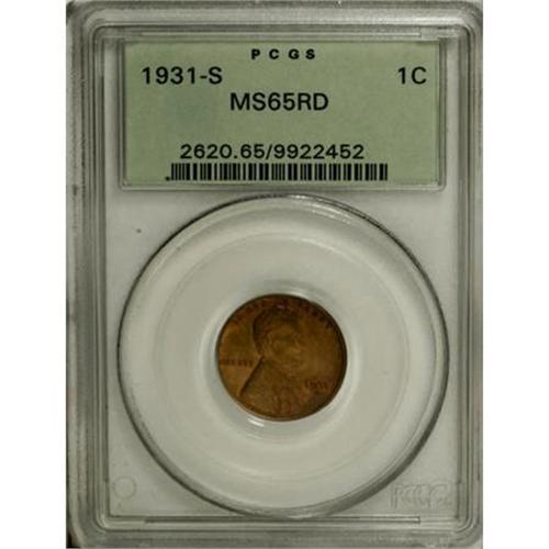 <B>1931-S 1C MS65 Red PCGS.</B></I> This precisely struck rose-red and olive-gold cent has beautifully mark-free fields, and carbon is also minimal. A popular low mintage issue, encased in a green label holder.<BR><BR><B>Coin Engraver:</B> Victor D. Brenner<BR><BR><b>Shipping:</b> Coins & Currency (<a target="_blank" href="http://www.heritageauctions.com/common/shipping.php">view shipping information</a>)