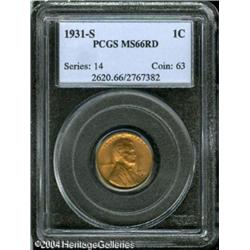 1931-S 1C MS66 Red PCGS. A lustrous Gem that has a <B>1931-S 1C MS66 Red PCGS.</B></I> A lustrous Gem that has a sharp strike and radiant pumpkin-orange color. Although the low mintage 1931-S is a notoriously hoarded issue, it becomes conditionally rare in this grade. Population: 78 in 66, 0 finer (10/04). <BR><BR><B>Important notice:</B> Heritage usually auctions material at the rate of 200-250 lots per hour. On some occasions eBay Live bid software or the Internet may not be able to keep up with the pace of the auction. We recommend placing a realistic absentee bid now as insurance to avoid disappointment. Occasionally the auctioneer may eliminate or reject an eBay Live bid, and the auctioneer may also reopen a lot after the close of the eBay live bidding (usually because we missed an audience bid), and may reject your bid even if it shows you as the winning bidder. By bidding via eBay Live, you agree that Heritage may award the lot to another bidder at its sole discretion under the circumstances described above or any other reasonable circumstances. Since eBay bids are not shown to us until we open the lot on the floor, we treat those bids just like floor bids. In most cases the floor responds before the eBay bid is presented to us, due to Internet lag time, so for consistency we have made it a policy that floor bids are always considered first over tie eBay live bids. Also please note that all Heritage lots purchased through eBay Live carry a 20% Buyer's Premium. Please make sure you read the Terms and Conditions before you bid. This lot is being auctioned in conjunction with a live floor auction by Heritage Galleries & Auctioneers. All final auction and invoice information will be supplied by Heritage Galleries & Auctioneers, and all other information should be considered preliminary. Lot:5325