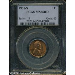 <B>1931-S 1C MS66 Red PCGS.</B></I> A sharply struck key date Lincoln. Bright orange patina overlays lustrous surfaces, and several small toning spots are scattered over the reverse. Population: 79 in 66, 0 finer (1/05). Lot:5525