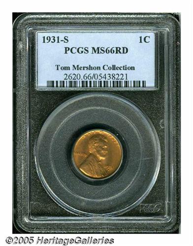 <B>1931-S<1C> MS66 Red PCGS.</B></I> Only 866,000 pieces were struck of the 1931-S, making it a key date in terms of mintage; however, quite a few were saved and Mint State examples are easily located. Spotting seems to be the problem that limits the upper-end potential of most coins. This is a bright cherry-red example that shows virtually no spotting to the unaided eye. A very attractive Gem '31-S Cent. Population: 79 in 66, 0 finer (3/05).<BR><I>From The Tom Mershon #2 All-Time PCGS Registry Set of Lincoln Wheat Cents.</B></I>