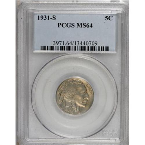 <B>1931-S 5C MS64 PCGS.</B></I> PCGS Population (1169/1609). NGC Census: (587/684). Mintage: 1,200,000. Numismedia Wsl. Price for NGC/PCGS coin in MS64: $104. (#3971)<BR><BR><B>Coin Engraver:</B> James E. Fraser<BR><BR><b>Shipping:</b> Coins & Currency (<a target="_blank" href="http://www.heritageauctions.com/common/shipping.php">view shipping information</a>)
