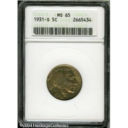 1931-S 5C MS65 ANACS. Sharply struck, with low-int <B>1931-S 5C MS65 ANACS.</B></I> Sharply struck, with low-intensity iridescent multicolored toning. A couple of minute marks are noted on the Indian's cheek. <BR><BR><B>Important notice:</B> Heritage usually auctions material at the rate of 200-250 lots per hour. On some occasions eBay Live bid software or the Internet may not be able to keep up with the pace of the auction. We recommend placing a realistic absentee bid now as insurance to avoid disappointment. Occasionally the auctioneer may eliminate or reject an eBay Live bid, and the auctioneer may also reopen a lot after the close of the eBay live bidding (usually because we missed an audience bid), and may reject your bid even if it shows you as the winning bidder. By bidding via eBay Live, you agree that Heritage may award the lot to another bidder at its sole discretion under the circumstances described above or any other reasonable circumstances. Since eBay bids are not shown to us until we open the lot on the floor, we treat those bids just like floor bids. In most cases the floor responds before the eBay bid is presented to us, due to Internet lag time, so for consistency we have made it a policy that floor bids are always considered first over tie eBay live bids. Also please note that all Heritage lots purchased through eBay Live carry a 20% Buyer's Premium. Please make sure you read the Terms and Conditions before you bid. This lot is being auctioned in conjunction with a live floor auction by Heritage Galleries & Auctioneers. All final auction and invoice information will be supplied by Heritage Galleries & Auctioneers, and all other information should be considered preliminary. Lot:5602