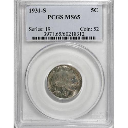 <B>1931-S 5C MS65 PCGS.</B></I> PCGS Population (1276/351). NGC Census: (620/74). Mintage: 1,200,000. Numismedia Wsl. Price for NGC/PCGS coin in MS65: $280. (#3971)<BR><BR><B>Coin Engraver:</B> James E. Fraser<BR><BR><b>Shipping:</b> Coins & Currency (<a target="_blank" href="http://www.heritageauctions.com/common/shipping.php">view shipping information</a>)