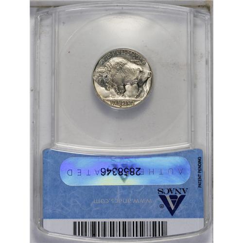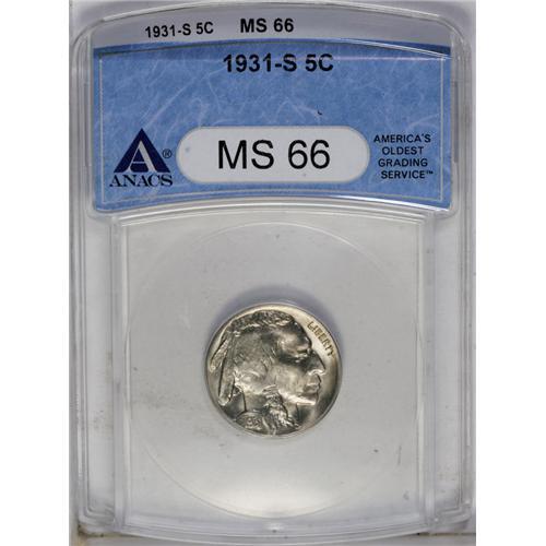 <B>1931-S<5C> MS66 ANACS.</B></I> The satiny and nearly mark-free surfaces are toned champagne with tiny patches of pale blue. The bison's head is well struck on this Premium Gem.