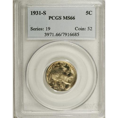 <B>1931-S 5C MS66 PCGS.</B></I> The slightly golden-tinged surfaces are highly lustrous and display crisply struck design elements. Both sides are impressively preserved, with a single tiny mark on the bison's shoulder noted only for the sake of accuracy. PCGS has only graded one example finer (4/07).<BR><BR><b>Shipping:</b> Coins & Currency (<a target="_blank" href="http://www.heritageauctions.com/common/shipping.php">view shipping information</a>)