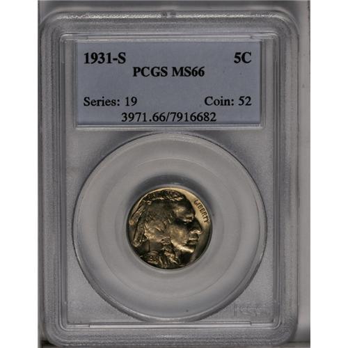 <B>1931-S<5C> MS66 PCGS.</B></I> Well struck save for weakness above the Indian's hair braid, with even olive-gold coloration and gleaming luster. A faint die crack extends through the bison's upper hair detail. Surface marks are nearly nonexistent. Just one example of this issue has been graded finer by PCGS (6/06).