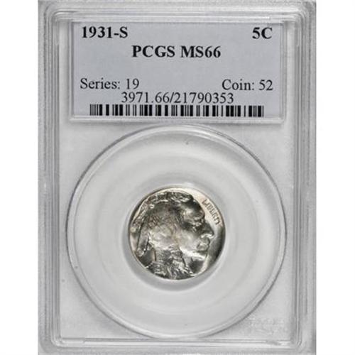 <B>1931-S 5C MS66 PCGS.</B></I> Though the 1931-S nickels were saved in quantity and examples are available even in Premium Gem, PCGS has graded just one finer example (8/07). This pleasingly detailed piece offers vibrant luster and delicate sky-blue and champagne tints.<BR><BR><B>Coin Engraver:</B> James E. Fraser<BR><BR><b>Shipping:</b> Coins & Currency (<a target="_blank" href="http://www.heritageauctions.com/common/shipping.php">view shipping information</a>)