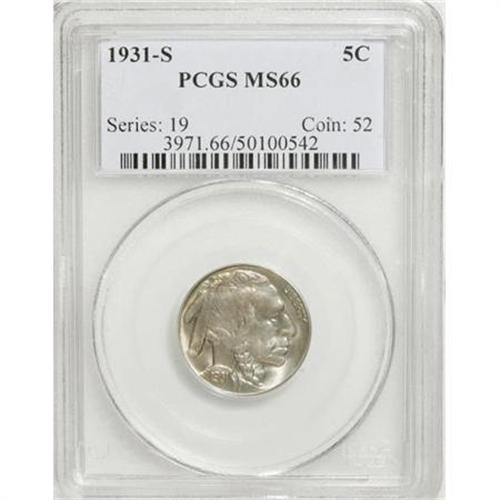 <B>1931-S 5C MS66 PCGS.</B></I> PCGS Population (349/1). NGC Census: (67/2). Mintage: 1,200,000. Numismedia Wsl. Price for NGC/PCGS coin in MS66: $850. (#3971)<BR><BR><B>Coin Engraver:</B> James E. Fraser<BR><BR><b>Shipping:</b> Coins & Currency (<a target="_blank" href="http://www.heritageauctions.com/common/shipping.php">view shipping information</a>)