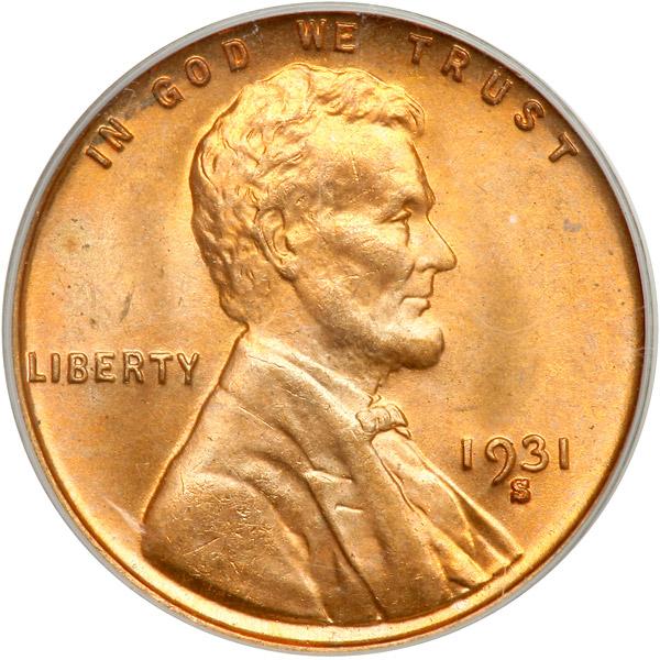 1931-S Lincoln Cent. PCGS graded MS-65 Red. Housed in an Old Green Holder. A nice strike with attractive red color on this key date from the 1930s. Only 866,000 were made. Pop 739; 84 finer (PCGS # 2620) .
