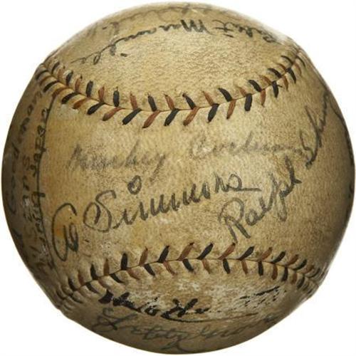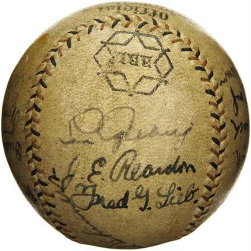 <B>1931 Tour of Japan Team Signed Baseball with Gehrig.</B></I> Far scarcer than team balls from the more widely recognized 1934 Tour are those from the trip across the Pacific three years earlier, featuring a smaller (but still star-studded) cast of diamond icons. Presented is one of the finest specimens we've encountered from that limited supply, boasting seventeen bold black fountain pen signatures on an "Official Six University League of Tokyo" baseball. Most noteworthy is an 8/10 offering from the great Lou Gehrig, who would make the trip again in '34. He's joined by fellow Hall of Famers Cochrane (5/10), Simmons (8/10), Grove (8/10), Frisch (9/10), Kelly (3/10) and Maranville (8/10). 1924 World Series hero Muddy Ruel (7/10) is here as well. The balance of signatures average a solid 7/10, with only a single deviation from that impressive theme. A large inscription in an unknown hand fills a side panel, and reads, "To our good Friend Fred Goodman, All Stars touring Japan '1931.'" A light coating of shellac has provided an amber tone, but has served its duty of autograph preservation admirably. As a memento documenting a key step in the globalization of the sport of baseball, this sphere carries tremendous historical importance, and should garner significant bidding accordingly. <I>LOA from PSA/DNA. LOA from James Spence Authentication.</B></I><BR><BR><b>Shipping:</b> Balls, Pucks, etc., Small (<a target="_blank" href="http://www.heritageauctions.com/common/shipping.php">view shipping information</a>)