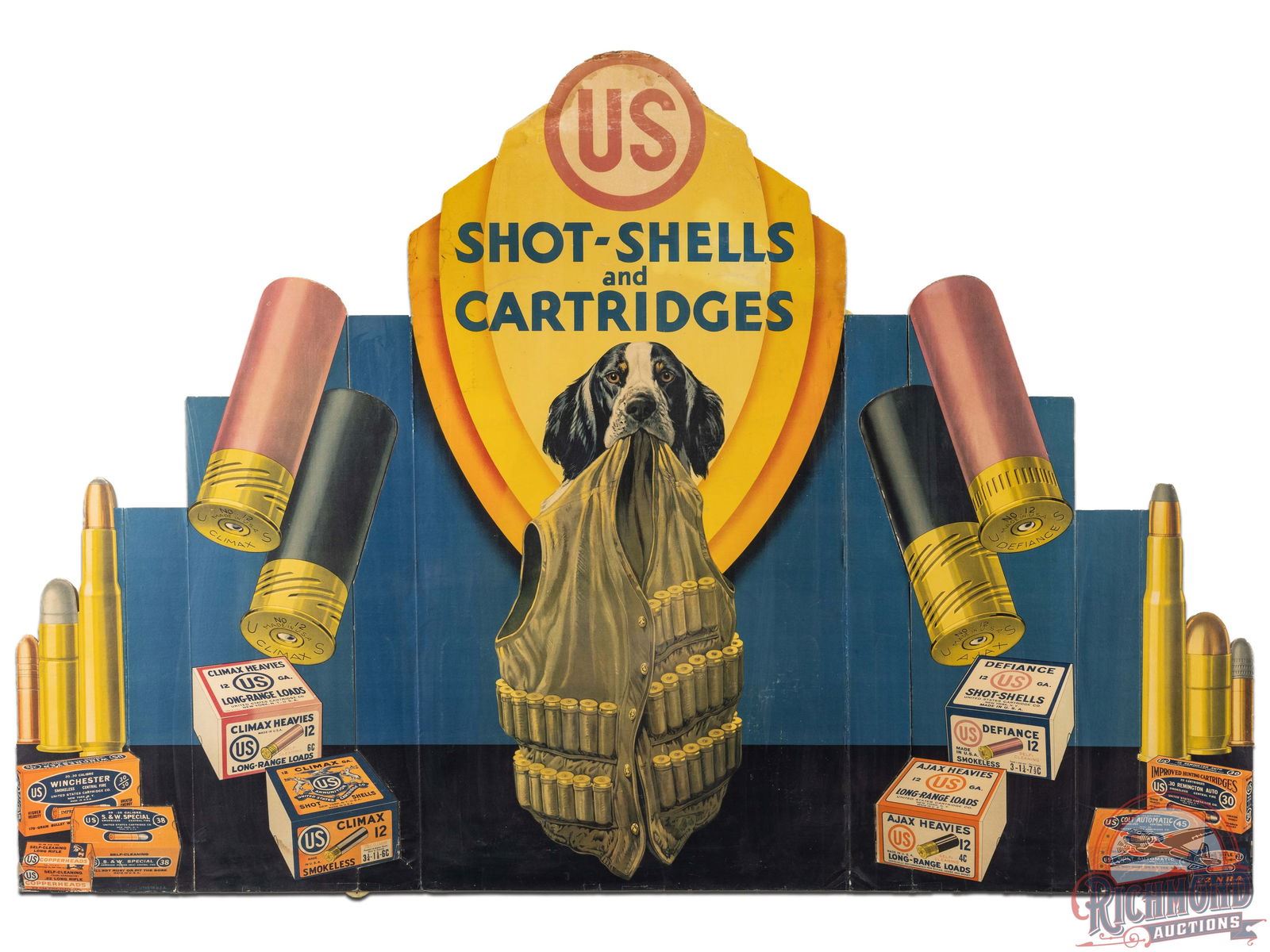 Large cardboard die cut sign with excellent graphics and moderate color, circa 1931. Featuring a hunting dog holding a shooting vest and ready to go! Multiple boxes of shotguns shells and rifle cartridges pictures including Winchester 30-30, .38 S&W Special, .22 LR Copperheads, Climax, Climax Heavies, Defiance, Ajax Heavies, .30 Remington Auto, .45 Colt Auto and .22 LR NRA. Exhibits general age and storage wear including some paper loss, chips and mild tears, predominately along the edges and seams. The upper shield area shows more wear with spots, staining and a crease across extending through "US." A must have piece for hunters with a good hunting dog! Marked CS101 4-31 on bottom right and Litho USA on bottom left. 37" H x 56" W.