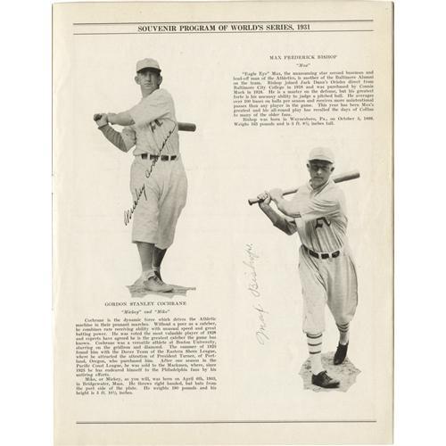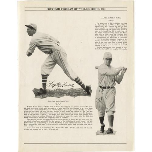 <B>1931 World Series Program Signed by the Philadelphia Athletics.</B></I> Though Connie Mack's second great dynasty failed to make it three World Championships in a row this October, the devoted collectors of Philadelphia Athletics memorabilia should have a great affinity for this publication printed for the Series. All twenty-nine Mack Men pictured within its pages have autographed their images in the boldest of black fountain pen ink, including diamond immortals like Foxx, Grove, Simmons, Cochrane, Hoyt and the rest of the American League Champs. Particularly noteworthy is a photographic image of coaching staff Earle Mack, Eddie Collins, Connie Mack and former Black Sox manager Kid Gleason, likewise signed by each. Gleason and Mack have been deemed secretarial. Even team owner Thomas Shibe checks in, a tremendously tough signature absent from many top A's collections! The program remains in impressive condition as well, solid and complete with no creasing or staining. Two and a half inches of cover separation at the top of the spine is the only noteworthy condition issue, and this has no effect on the display or the structural integrity of the publication. A rare treasure. <I>LOA from PSA/DNA. LOA from James Spence Authentication.</B></I><BR><BR><b>Shipping:</b> Small Flat (<a target="_blank" href="http://www.heritageauctions.com/common/shipping.php">view shipping information</a>)