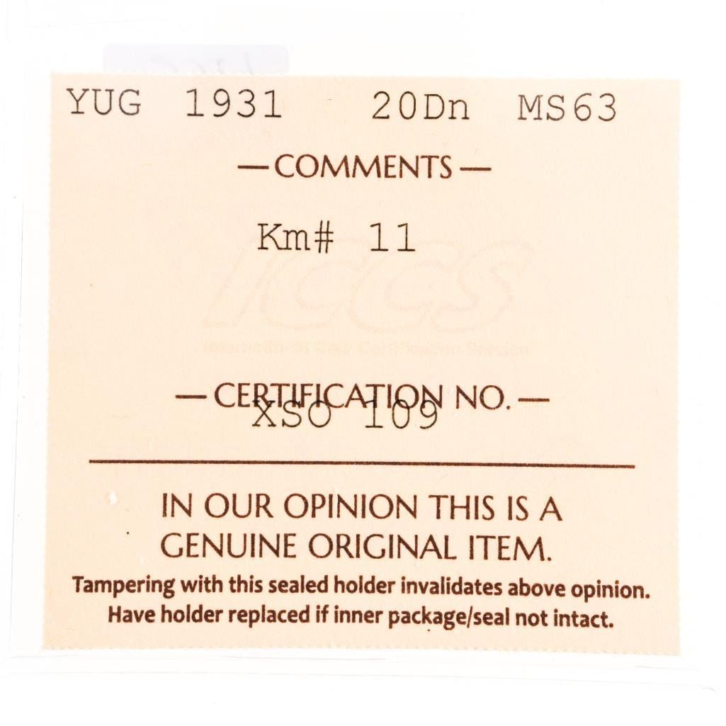 1931 YUG 20Dn KM#11 MS63 ICCS