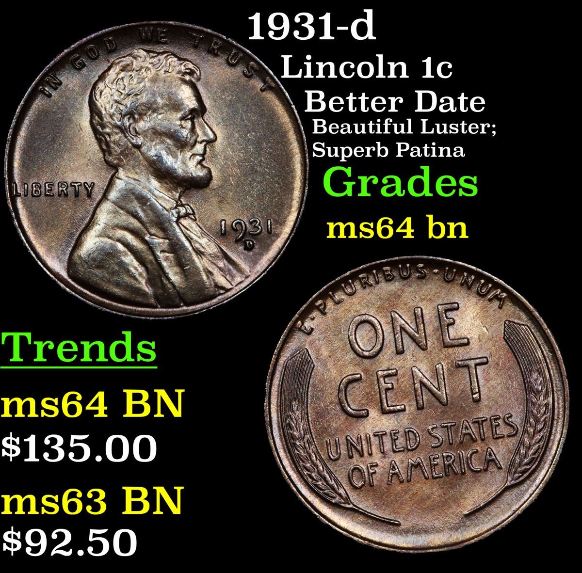 1931-d Better Date Beautiful Luster; Superb Patina Lincoln Cent 1c Grades Choice Unc BN.