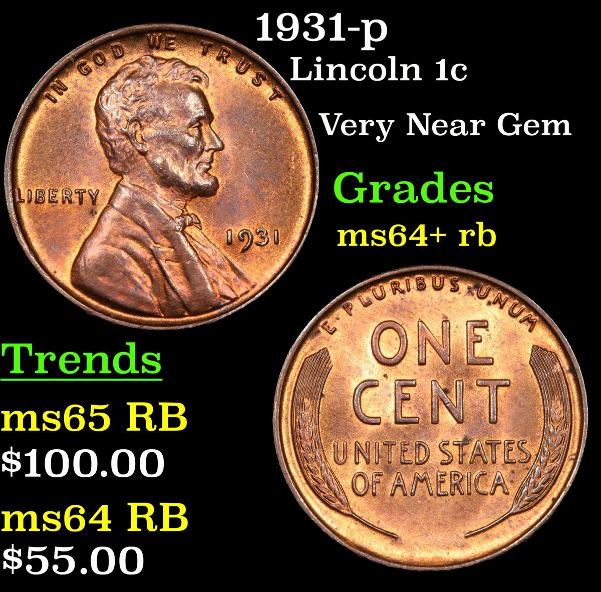 1931-p . Very Near Gem Lincoln Cent 1c Grades Choice+ Unc RB.