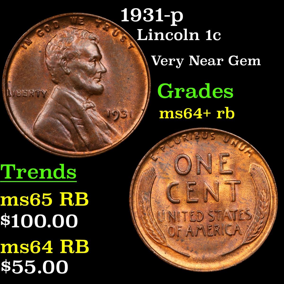 1931-p Lincoln Cent 1c Grades Choice+ Unc RB.