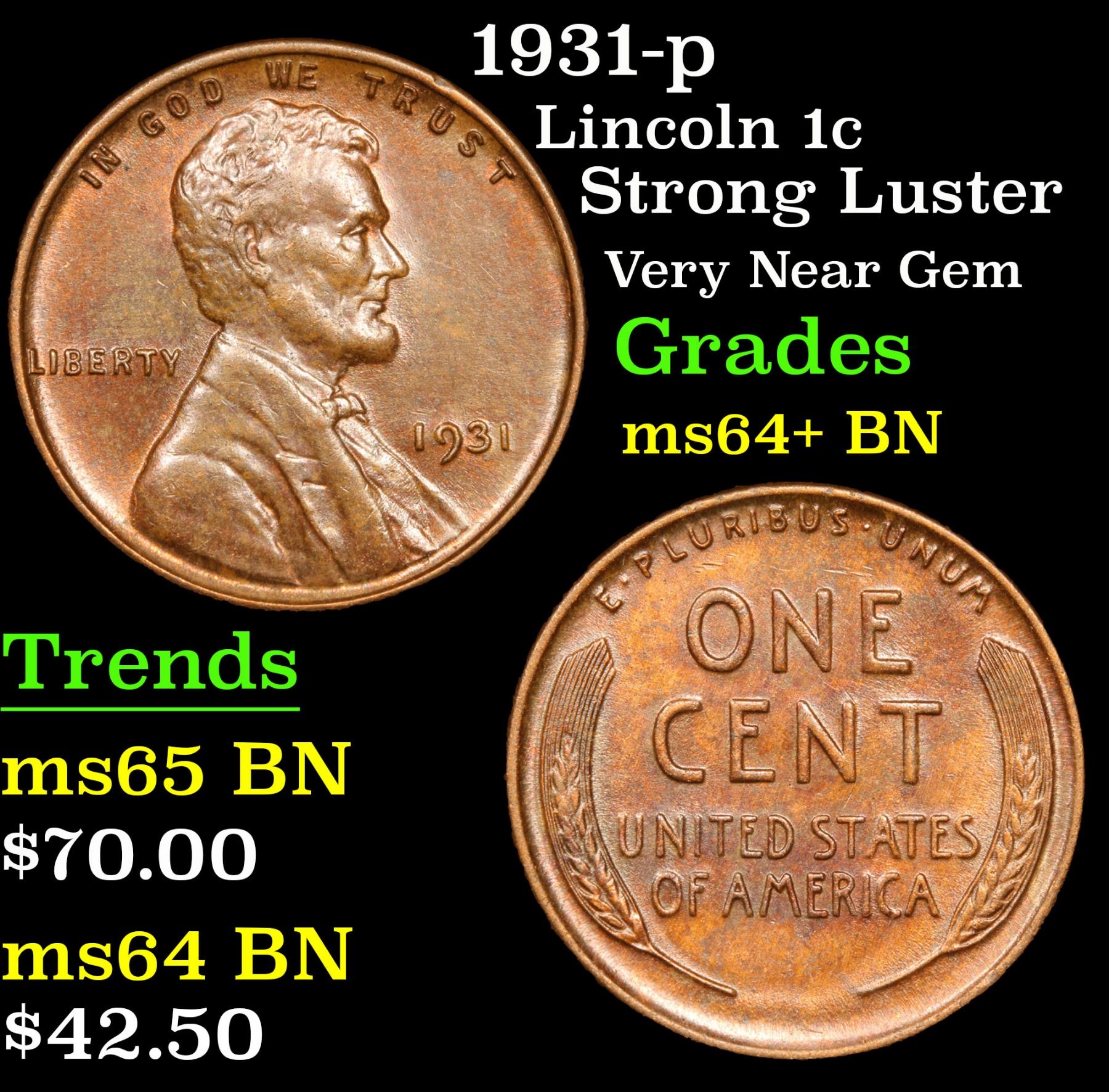 1931-p Strong Luster Very Near Gem Lincoln Cent 1c Grades Choice+ Unc BN.