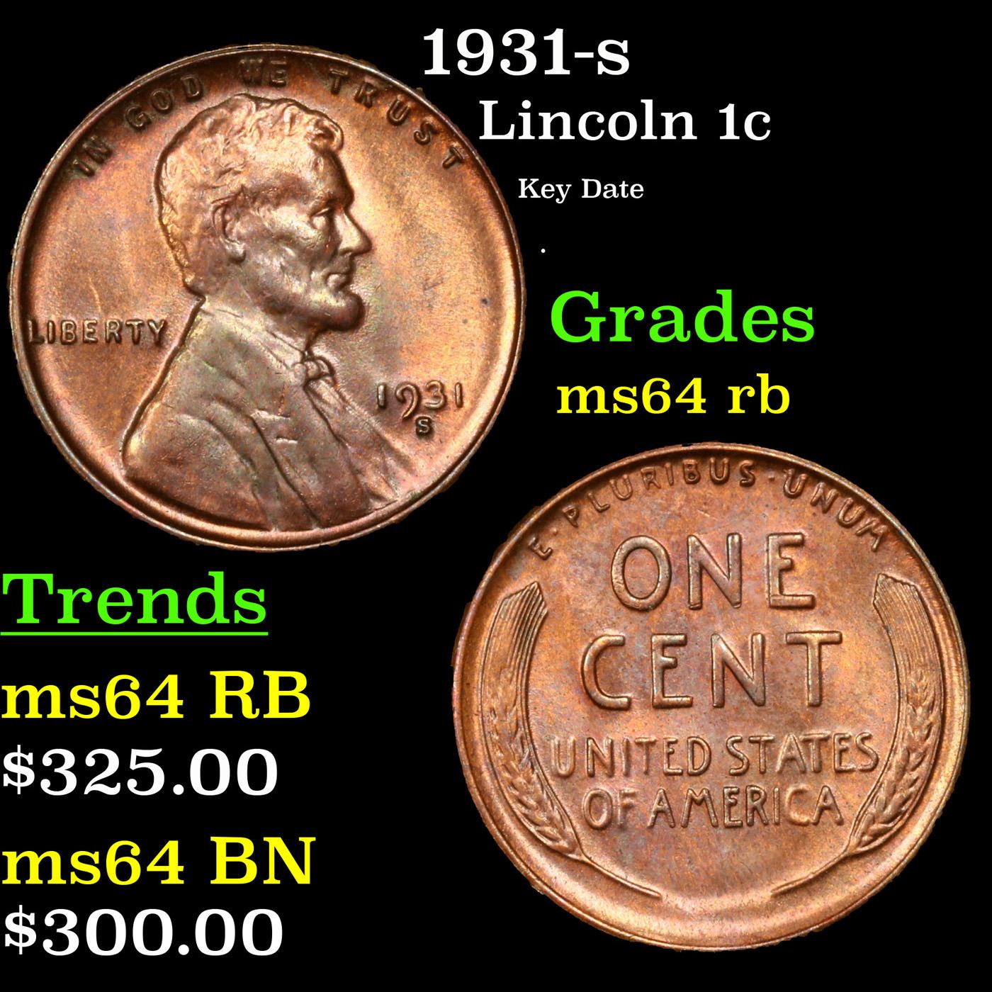 1931-s Lincoln Cent 1c Grades Choice Unc RB. Incredibly scarce, Semi Key date.