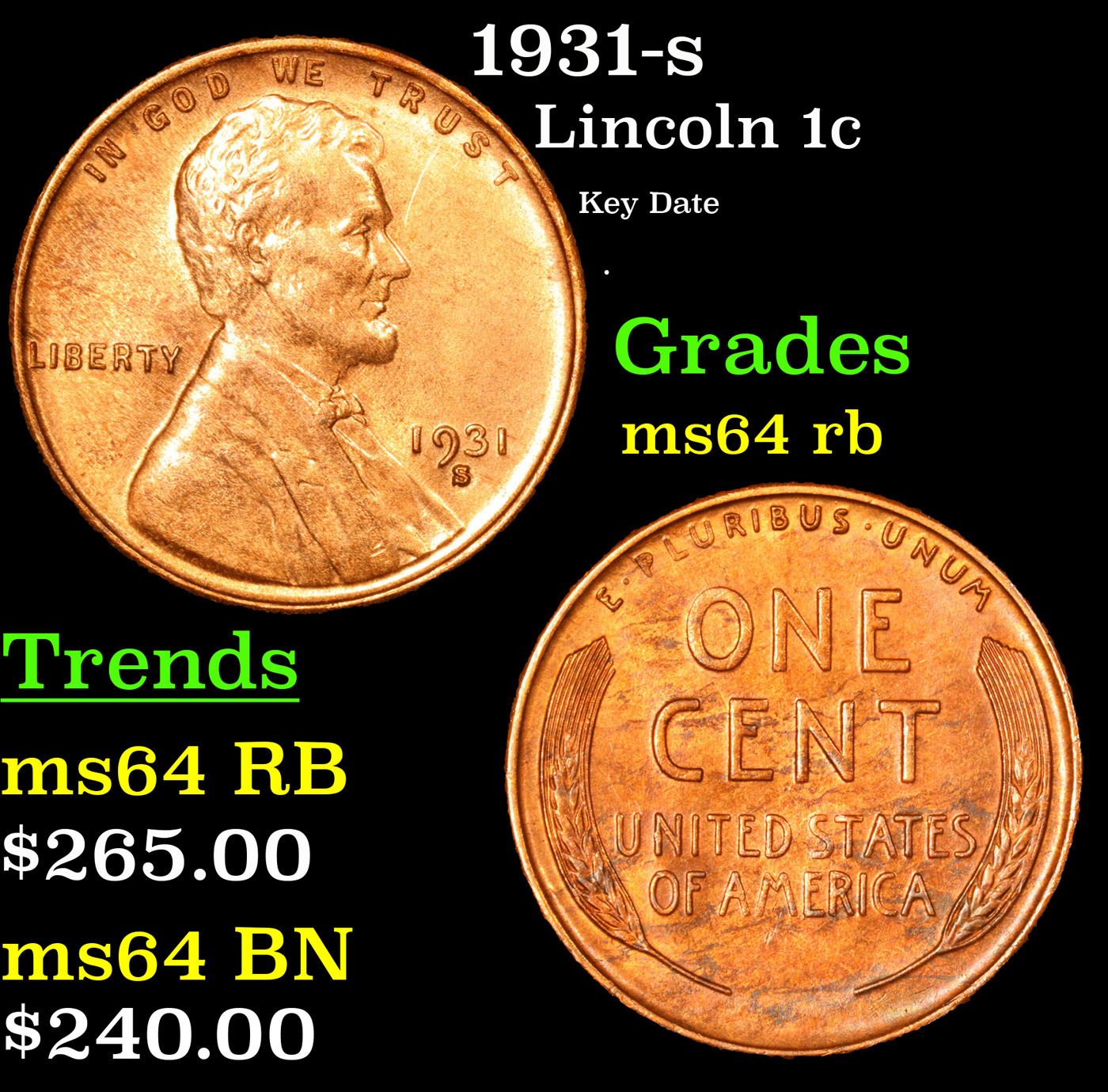 1931-s Lincoln Cent 1c Grades Choice Unc RB. Incredibly scarce, Semi Key date.