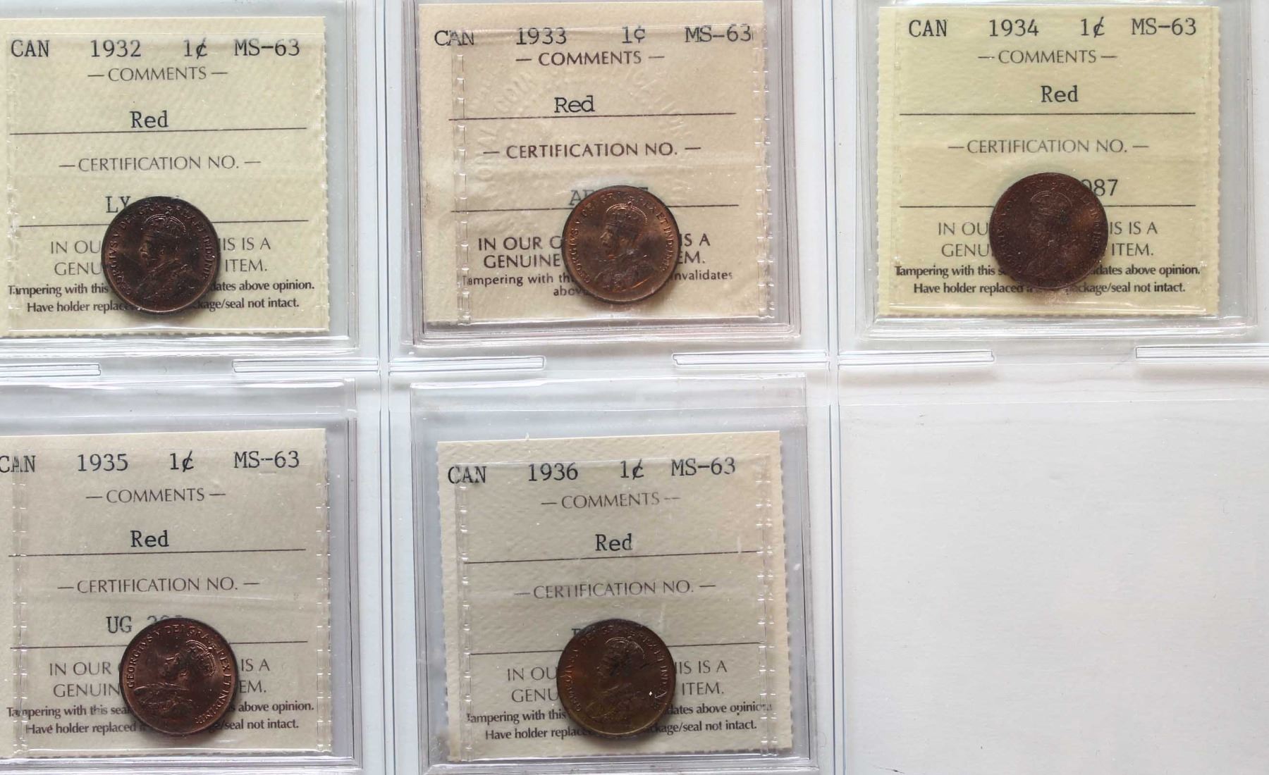 1932 1¢, 1933, 1934, 1935, 1936 All 5 coins ICCS Choice Mint State-63 Red.