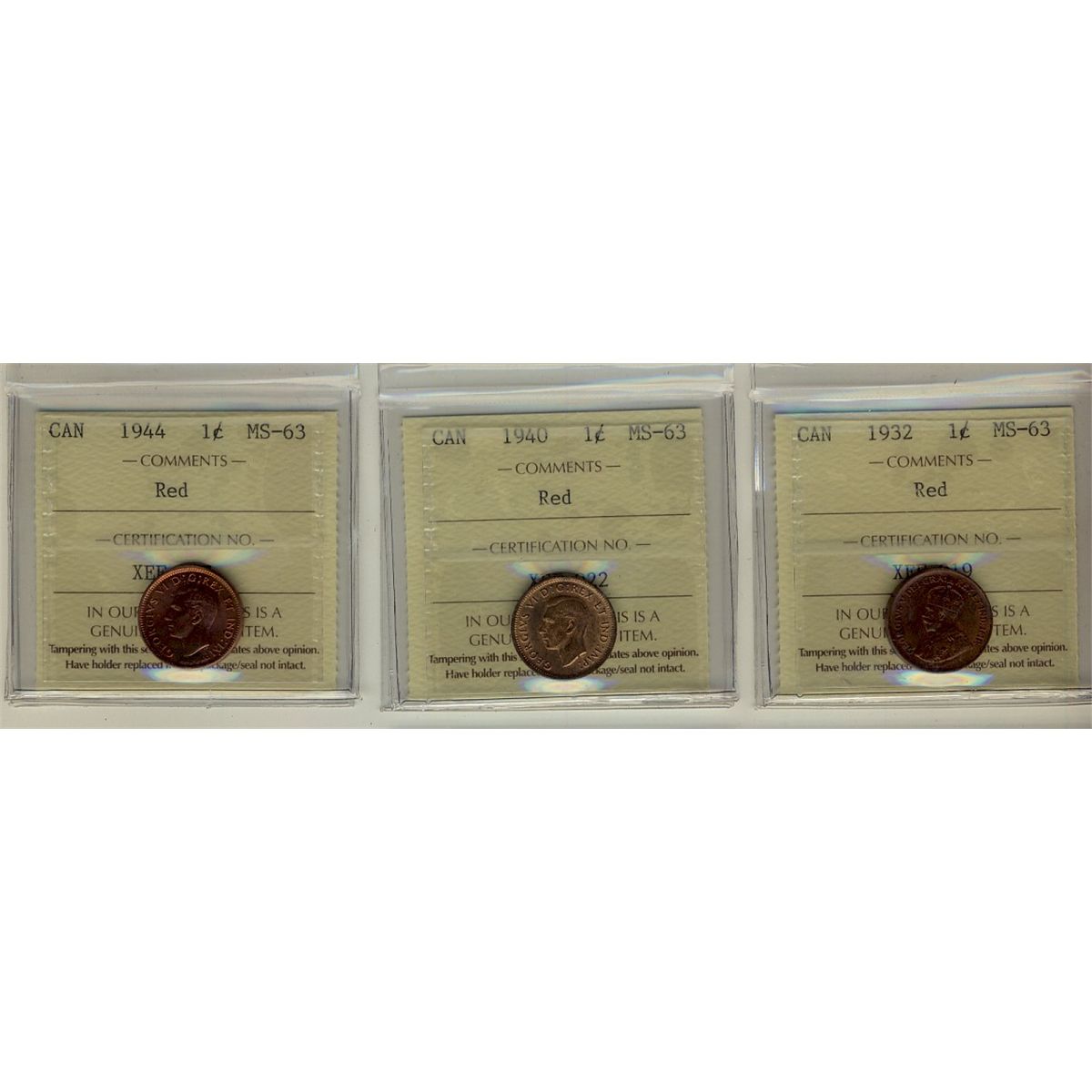 1932 1¢, 1940 & 1944 ICCS MS63RD. Lot of 3 coins.